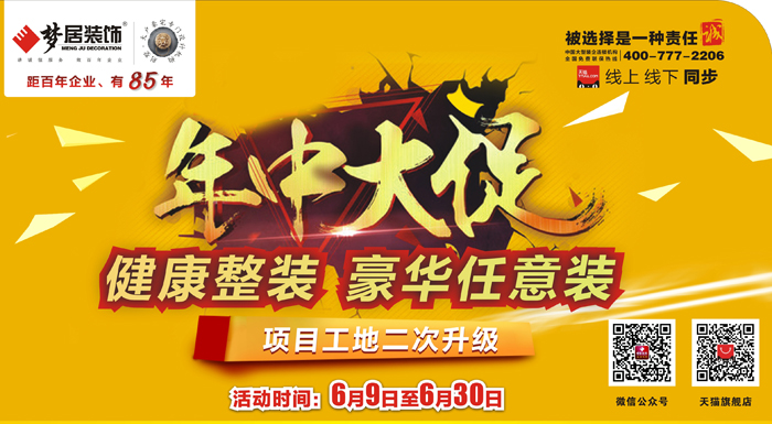体验了一翻梦居装饰的工地二次升级,你是不是很心动,想立刻把自己的新房也用上这么好的工艺?时机来了!6月正巧赶上梦居装饰年中大促,推出“健康整装”“豪华任意装”2个实惠套餐,正计划装修的朋友有福了,快快来报名参加活动吧!