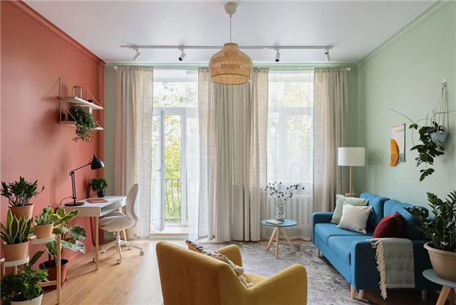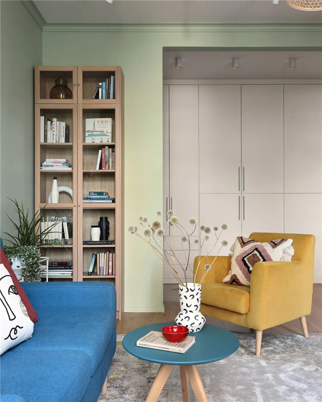 而厨房则采用了绿色橱柜和温馨阳光的用餐区